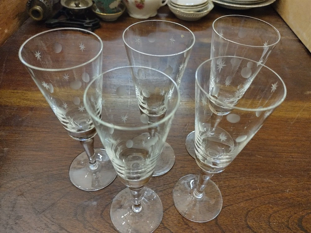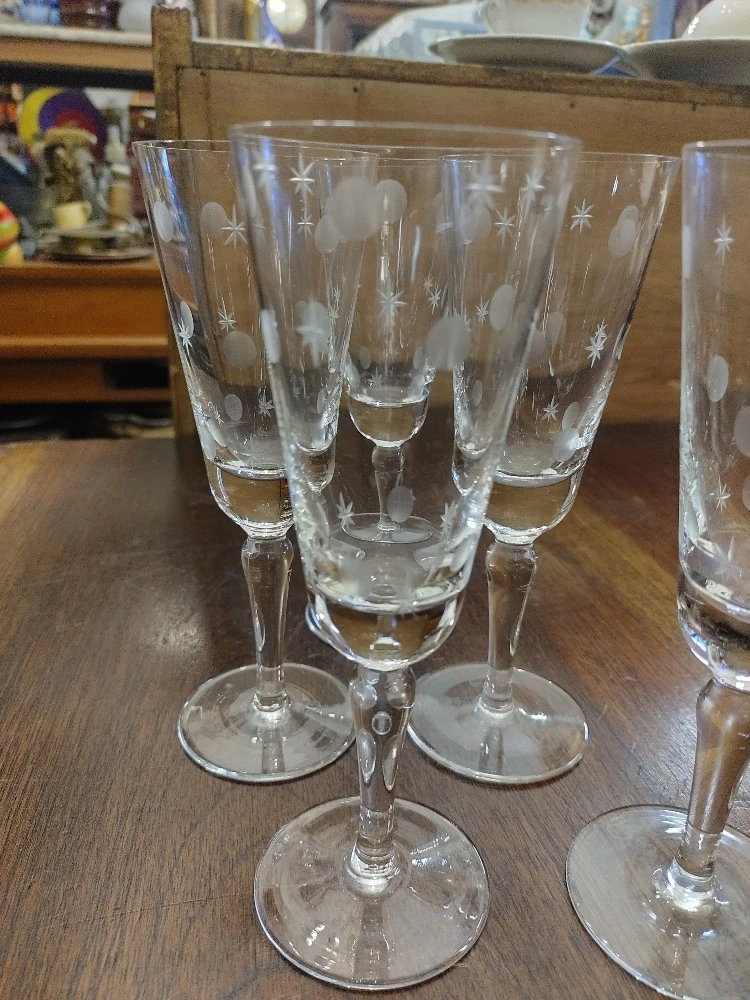 Juego 4 Copas Decoradas. Detalle 1 con Chip en Boca. MEDIDAS: 17,5cm Alt x 6cm Diam Boca. En las fotos se ven 5 pero son 4 ya que una se rompio. Envíos a Todo el País. SOMOS MAITAGALLI ANTIGUEDADES ROSARIO.