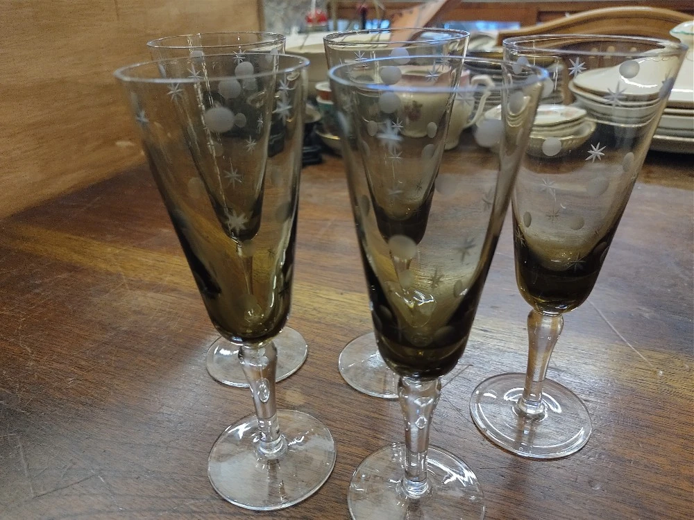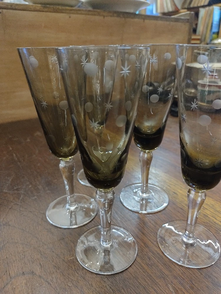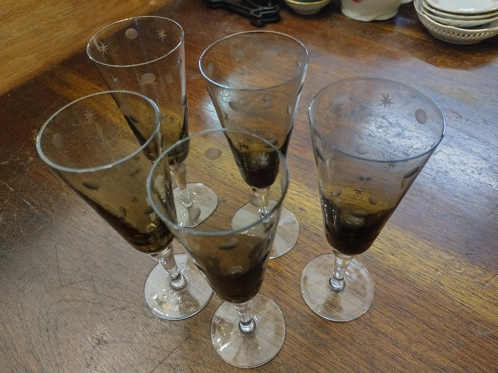 Juego 5 Copas Decoradas Color Negro. Detalle 1 con Chip en Boca. MEDIDAS: 16cm Alt x 5,5cm Diam Boca. Envíos a Todo el País. SOMOS MAITAGALLI ANTIGUEDADES ROSARIO.